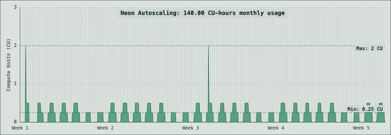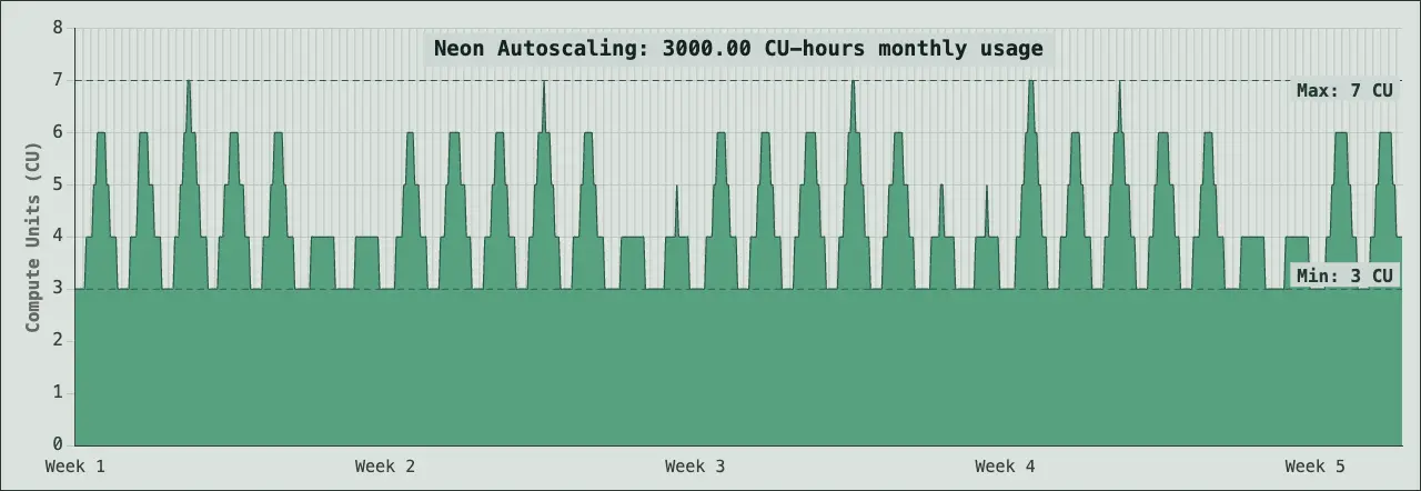 3,000 CU-hours compute, 100 GB-month of storage. As an example, a database that is scaling between 3 CU and 7 CU will often use around 3000 CU hours in a month. This level represents production applications with sustained traffic, higher data volumes, and more complex queries requiring consistent compute resources.