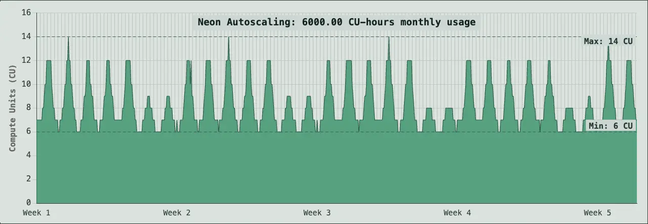 6,000 CU-hours compute, 1,000 GB-month of storage. A database scaling between 6 and 14 CU can use in the range of 6,000 CU hours in a month. This is representative of large-scale production workloads with high traffic volumes, extensive datasets, and applications requiring significant compute capacity and storage.