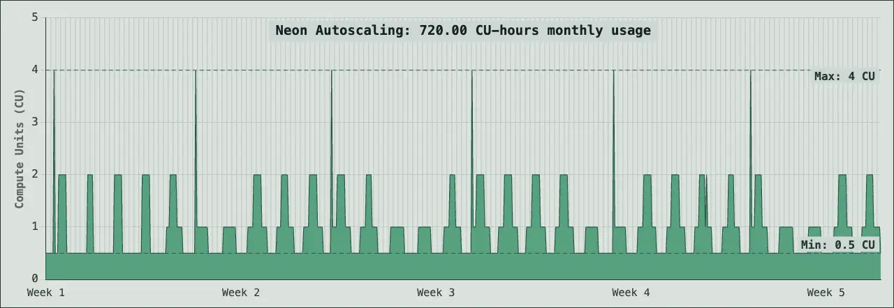 720 CU-hours compute, 10 GB-month of storage. Representative of a constant-load application database. As you can see from the autoscaling chart above, 720 CU hours translates to a database that scales between 0.5 and 4 CU based on load.